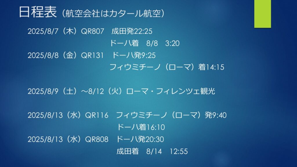 昨年(2024年)、最後のヨーロッパ旅行と称してスイスハイキング旅行3に行ったのだが、今年は春の連休に慢性硬膜下血腫で入院・手術するということがあり、いよいよ本当に最後かもしれないということでヨーロッパに再チャレンジした。行き先はなんとなくイングリッシュガーデンのイギリスなどと思ってはいたのだが、イギリスの政治状況が思わしくなく、左翼グローバリスト政権下で移民増加による犯罪も増加しているため、保守メローニ首相のもとに存在感を増しているイタリアにすることにした。無論、そういうことは別としてヨーロッパ美術の源流であるイタリア、私が慢性硬膜下血腫で手術をしたその日(令和7年4月30日)に、急性硬膜下血腫で逝去された国際美術史学会(CIHA: Comité international dʼhistoire de lʼ art)前副会長である田中英道先生がシスティーナ礼拝堂の天井画修復に立ち会われた、そのシスティーナ礼拝堂をこの目で見たい、というのが決定的な動機である。
