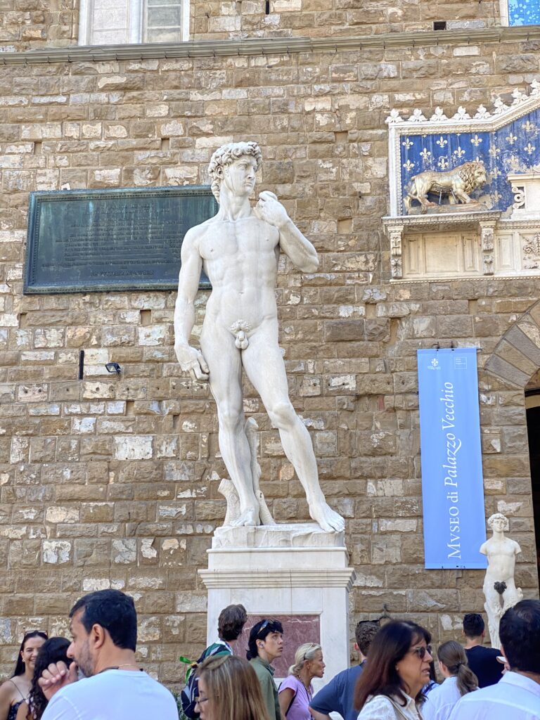 フィレンツェ・シニョリーア広場に置かれているミケランジェロのダヴィデ像だがこれは模造品で本物はアカデミア美術館に移設されている。この場所は市当局の政治的な意向で決められたもので、本物が長く置かれていた場所であろうから、アカデミア美術館で本物を見るより、こちらの方が見るのにふさわしいと言えなくもない。