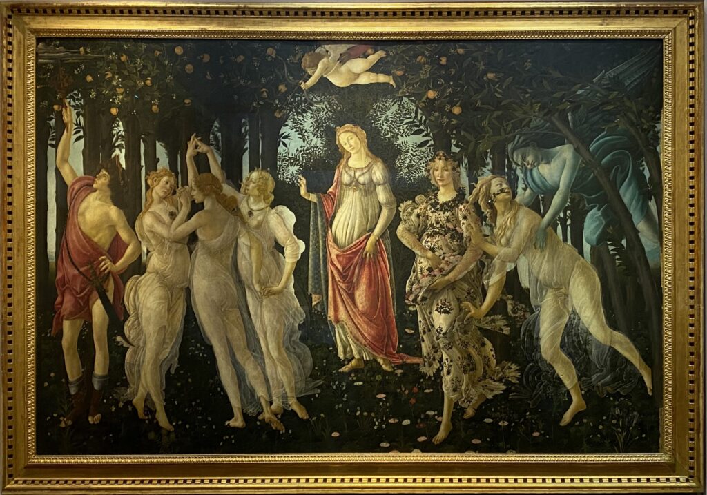 前掲書 1)イタリア美術史: 東洋から見た西洋美術の中心 P.236から本作の解説を少し引用する。右からゼフェロスは不毛の大地であるクロリュスを追いかけて捕え、彼女を春というフローラ像に変える。中央にはヴィーナスがいて、その頭上にはキュピッドが飛翔し三美神の中央のひとりをめがけて矢を射ている。その三美神の中央の女神は「貞節」の擬人像で俗的世界に背を向けている。その女神が眼をやっているのが左端のメルクリウスで、彼はすべてに背を向けて杖を振り上げ、雲の最後の一片を追い払っている。これはネオ・プラトニスム的な神聖な愛の高みに到達しなければならない地上の愛を象徴しているのである。これらの解釈についてはワーブルク派の研究(ワーブルク、ウィント、ゴンブリッジ)によるところが多い。中略。フローラの衣装の図柄として描かれる六十に及ぶ花模様は、ポリツィアーニの言葉《彼女は美しい。バラと花と植物で描かれた彼女の衣は美しい》の句をまさに絵画的に表現したもので、ヒヤシンス、すみれ、百合、つるにちそう、くわがた草、さらにいちはつの花など正確に描かれ、ボッティチェルリ自身、花模様の刺繍や壁掛けのデザインを行っていたことを窺がわせる。