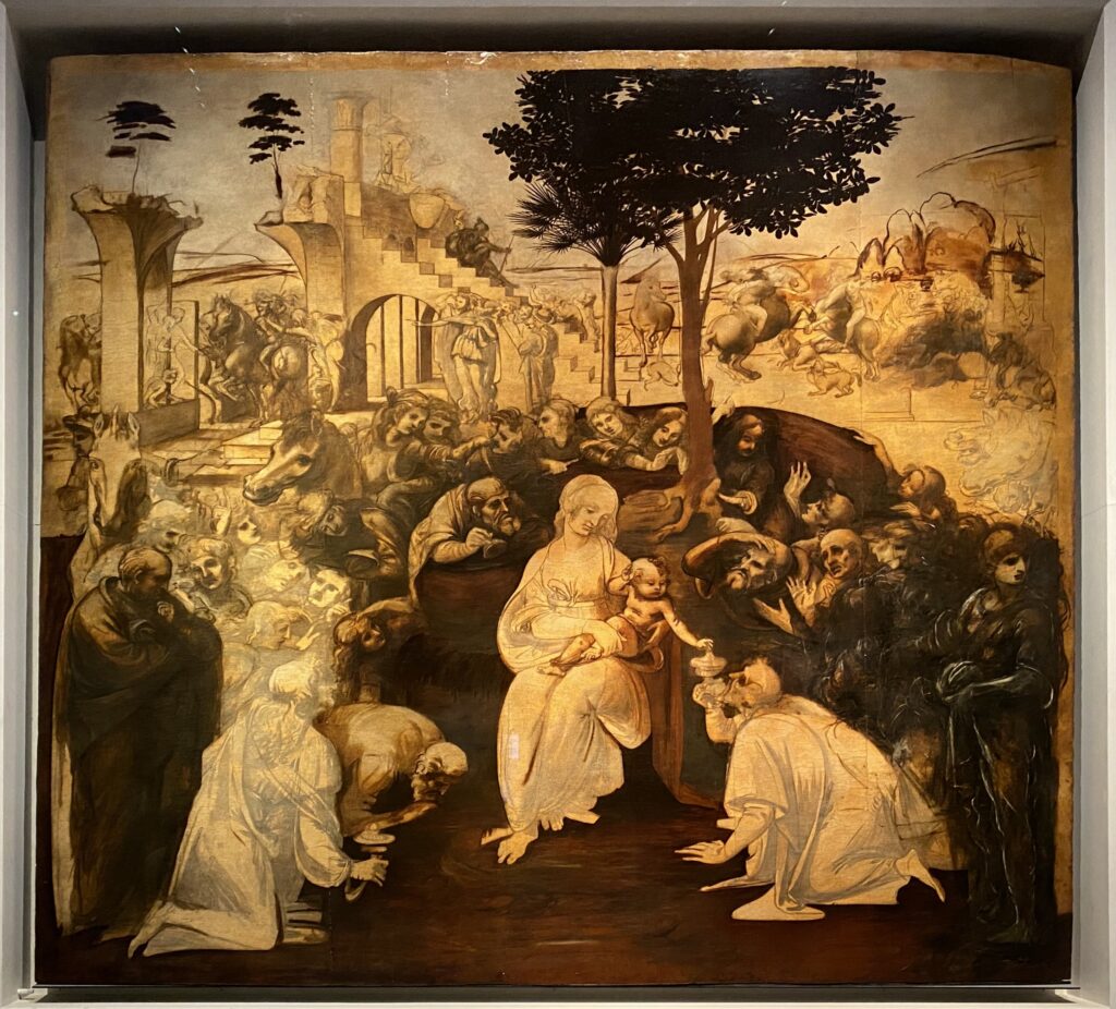 本作品については、前掲書 3)レオナルド・ダ・ヴィンチの世界像 の第一章 『三王礼拝』図と二重人物像 (P.6~P.36)からごく一部を引用して紹介する。この作品はレオナルド・ダ・ヴィンチの初期の作品で、1481年3月から9月まで約7か月間、レオナルドはこの作品に取り組んでいたことになるが、途中で中止されている。