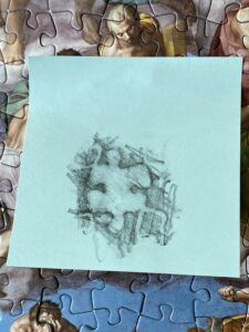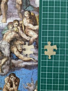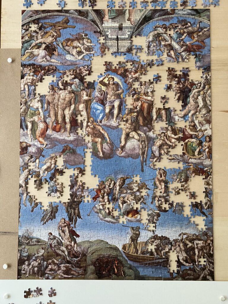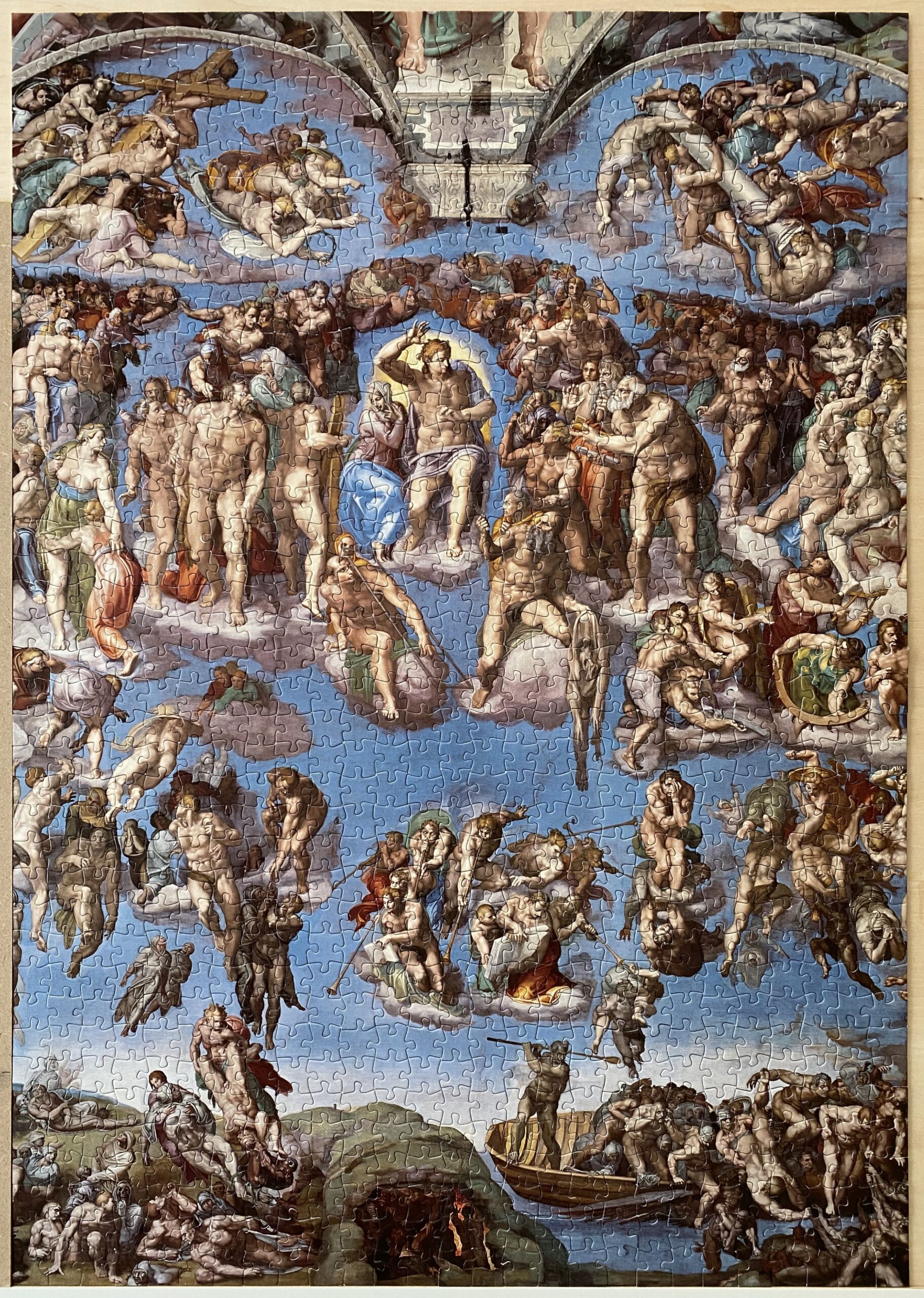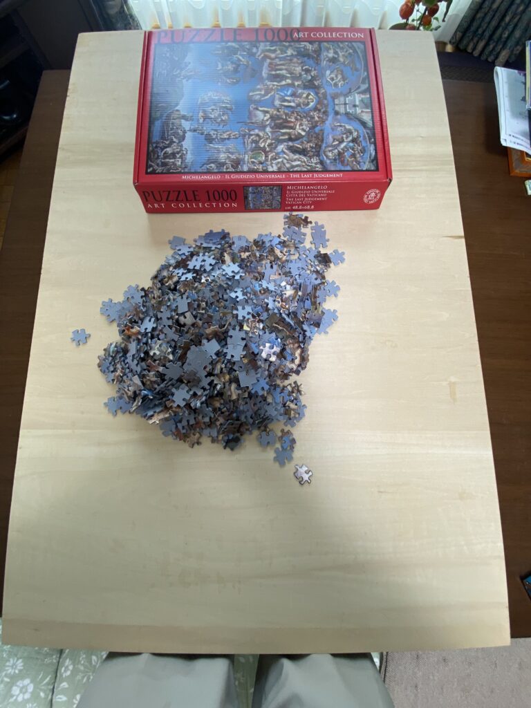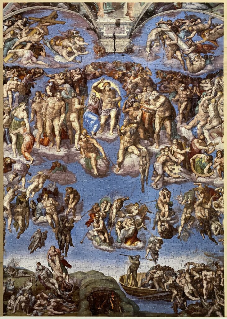 また、この絵には500人ほどの人物が描かれているそうで、何も描かれていない空の面積はそう多くないため1000ピースあるとはいえそんなに難しくないのではないかと考えていた。ある程度以上大きく描かれていいる人物は基本的に裸体なので、太ももやふくらはぎなど脚は比較的わかりやすい。しかし胸や腹はどんなに爺さんであっても何段にも筋肉が分割されているようすが描きだされていて、これは誰の胸肉なのというのが非常にわかりにくく、最後にとにかくピースの形であてはめるという力業でなんとか完成した。もも肉、むね肉と鶏肉扱いで大騒ぎしてやったが、これを全部ひとりで描き分けたミケランジェロは天才である。弟子にやらせるより自分がやった方が早いということでほとんど自分で描いたそうだ。