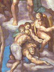 あと、やっていて気になったのは「さるまた穿かせ」である。前掲書 2)美術にみるヨーロッパ精神 P.174を引用すると、ミケランジェロにとって裸体とは人間の真実をあらわすものであり、一般的な意味での罪としての肉体の意味を超えたものであった。「最後の審判」の救われた人にあっても、人間ばかりではなく天国にいる聖者たち、さらにはキリスト自身にいたるまで裸体で描く必要があると考えていた。「最後の審判」の独自性はこのような人間の真実性の追究であり、人間界の出来事の止揚ともいうべきものなのである。中略。ヴァザーリが伝えるには、法王の式部長官がミケランジェロの制作中に、このような裸体の多い作品は法王の礼拝堂には適さぬ、、、といった。中略。彼を非難したのは芸術を解さぬ律儀な宗教家か役人か彼の名声に嫉妬ししている人びとだったのである。。。その急先鋒がピエトロ・アレンティーノという文筆家で、、、制作当時からミケランジェロに手紙をおくり、作品構想を指示したり、返礼にデッサンを所望したりし、つれなく当たられたと思うと攻撃に転じ、「最後の審判」の裸体画を非難した。中略 「さるまた穿かせ」(ブラゲットニー)というあだ名を与えられて、ダニエㇽラ・ダ・ヴォルテッラ、ダ・ファーノ、そしてカルネヴァーリ、ネッビアといった画家たちが、三十六人もの裸体に布を付ける仕事に従事した。後の二人はミケランジェロの死後、続けた人であり、さらに十八世紀にはポッツィという画家がなおも続けたのである。